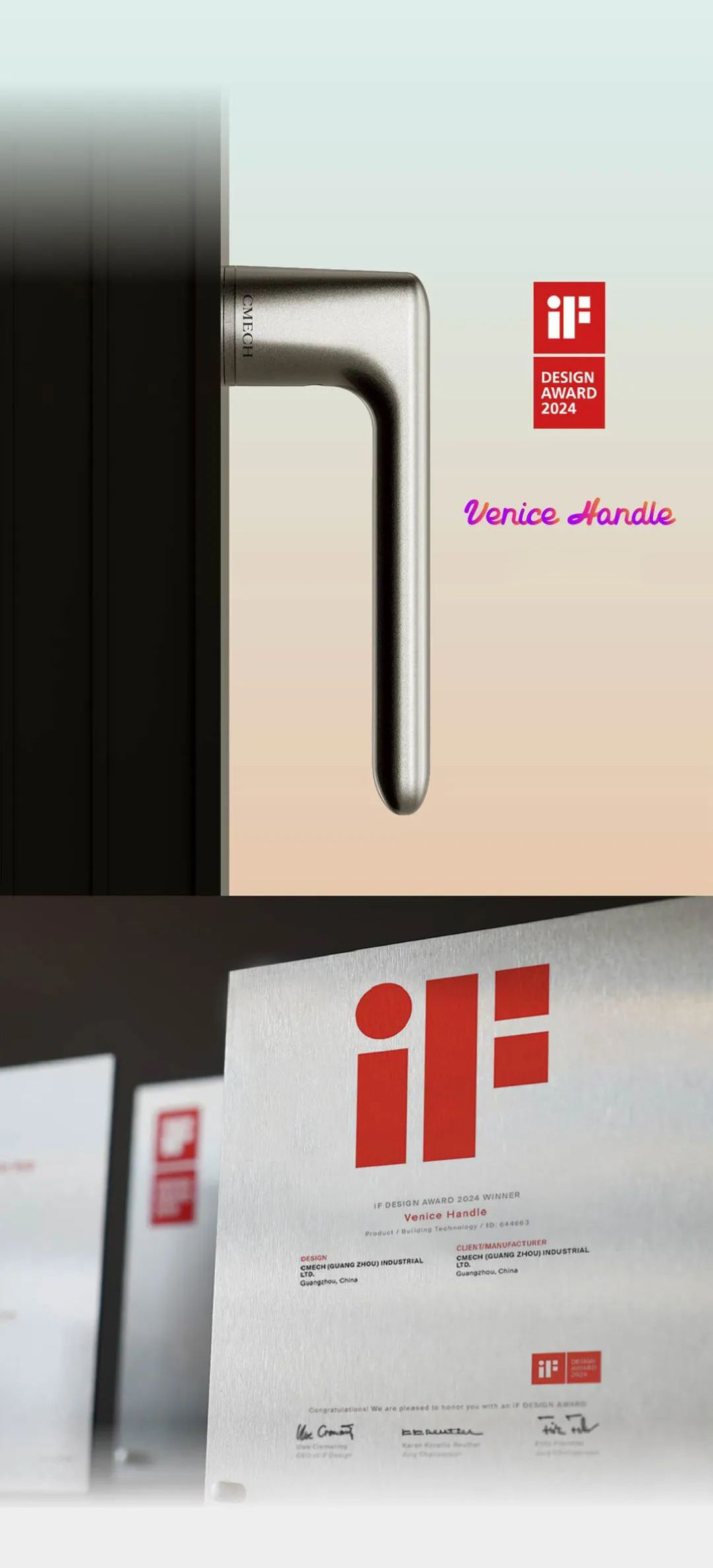 The CMECH Venice series handles have received the prestigious 2024 German iF International Design Award, earning unanimous acclaim from the judging panel for their exceptional appearance and functional innovation.